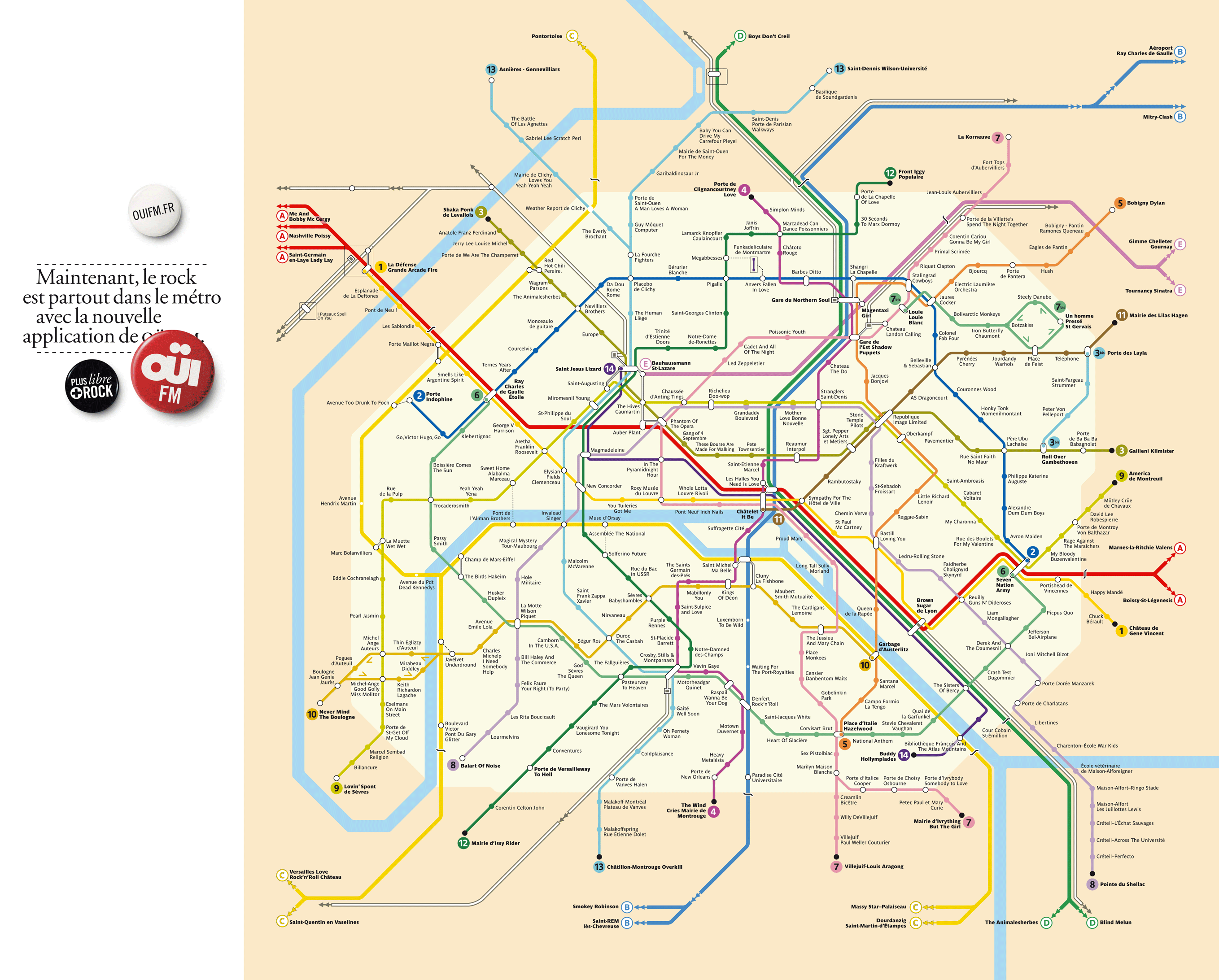 Ceux qui me suivent depuis un moment savent à quel point il m’est difficile de résister à un jeu de mot, surtout s’il est foireux. Alors toute une carte du métro parisien remplie de jeux de mots foireux et d’à-peu-près crapuleux sur des groupes de rock, vous pensez!